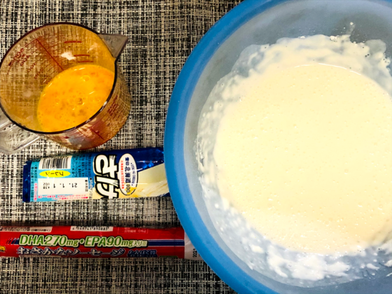 ・ホットケーキミックスと牛乳をよく混ぜ合わせて生地を作っておきましょう。
