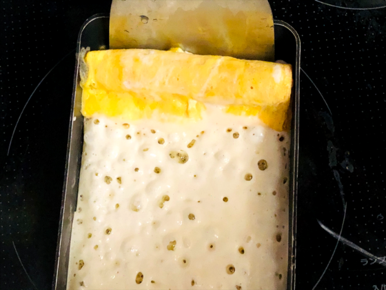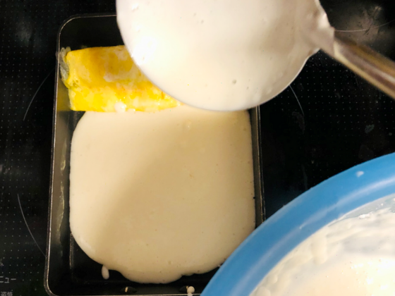 ② 巻き終わったら下ごしらえした生地を流し込み加熱していく。