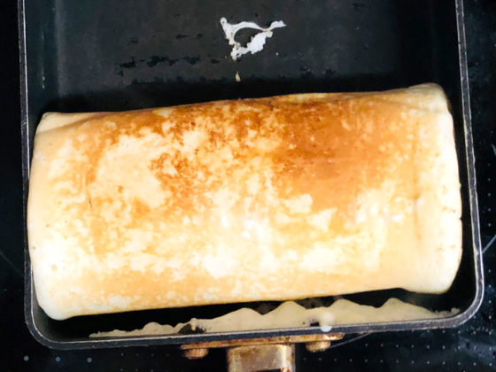 ③ 生地にぽつぽつと穴が空いてきたらフライ返しでクルクルと巻いていく(余った生地や具材も同じ要領でやってみましょう)!