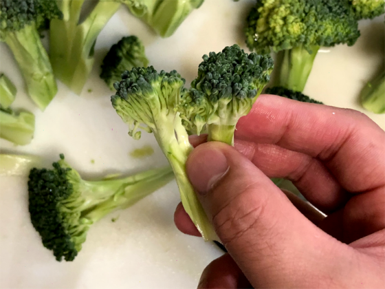 茹で時間を同じ程度にするために大きさを出来るだけ揃えましょう!この大きさをそろえる時にポイントとなるのが、緑のつぼみ部分まで包丁を入れてしまうと、バラバラになってしまうので『茎の部分から数センチほど切り込みを入れ、そこから手で割いていく』ことがポイントになります😁