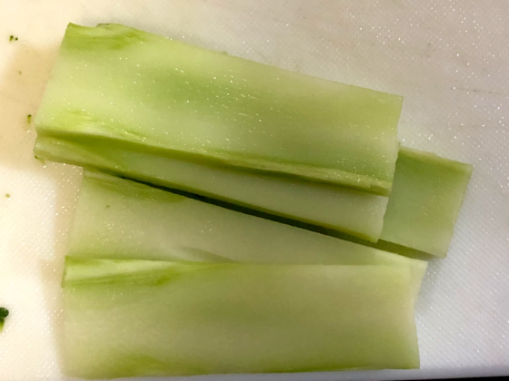 ブロッコリーの茎はまわりの硬い部分の皮を切り落として、白っぽい芯の部分だけにして調理するとやわらかく、美味しく食べることが出来ちゃいます🌟