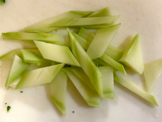 茎は、食べやすい幅に切っていきましょう(約7㎜幅の斜め切りが見栄えも良く料理に使いやすいかも)。