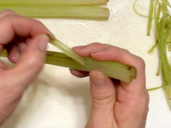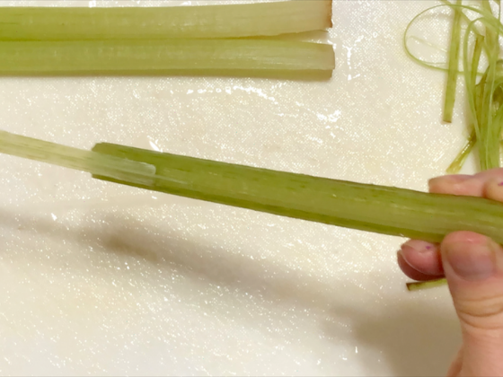 爪を立てて2〜3㎝ほど皮を剥き、一気に端まで皮を剥き取っていきましょう。次に、剥き残しがないかを確認し、ふき全部の皮と筋を取り除いていきましょう♪(´ε` )