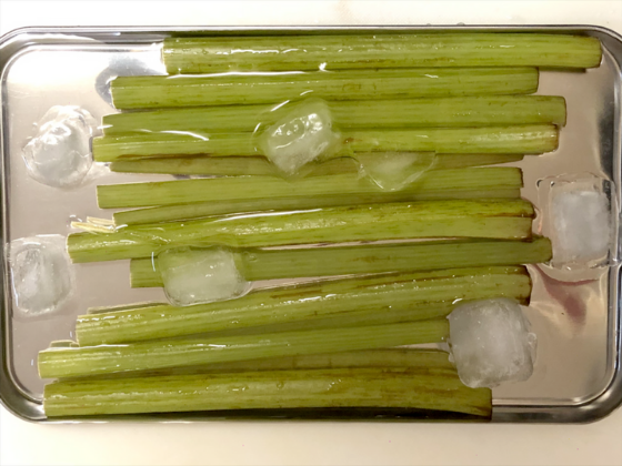 バットに冷水か氷水を作って用意しておき、細いふきから順にゆで上がるので、火が通ったふきから順に取り出して冷まします。