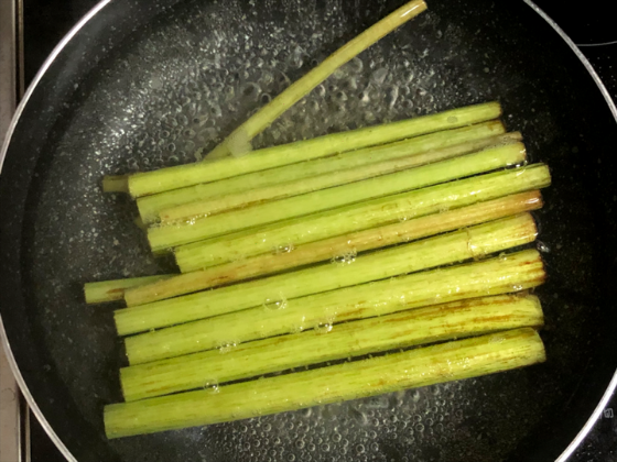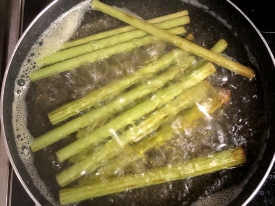 口径が広いフライパン(お鍋)を使用すると、手間がかかるふきの皮剥きがスムースに行うことができるようになります👀