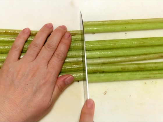 ふきを切るときは、ご家庭にあるフライパンやお鍋のサイズに合わせて切ってみましょう。ポイント:口径(こうけい)のいちばん広いフライパン(またはお鍋)を使うのがおすすめ。