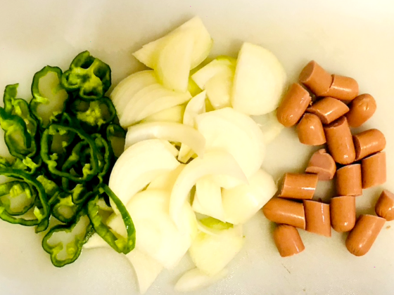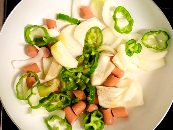 ・玉ねぎ、ピーマン、ウインナーを食べやすい大きさにカットする。