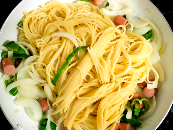 ② 具材がしんなりしてきたらパスタを投入し馴染ませる。