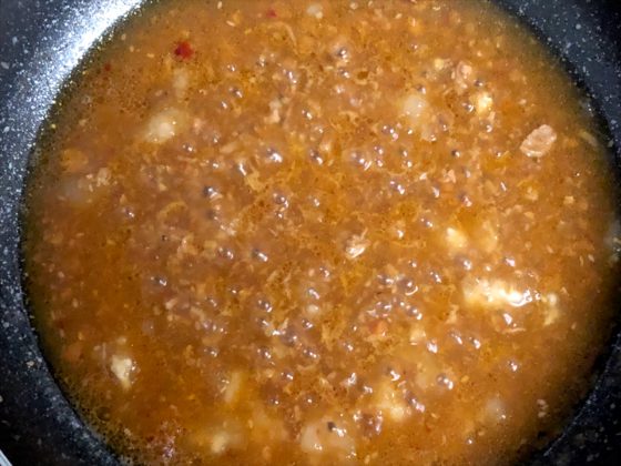 ① フライパンにごま油を入れ、鶏そぼろとジャージャー麺調味料を炒め合わせとろみがついてきたら火を止めておく。