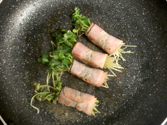ベーコンにかいわれを巻いて焼くだけの食べるおかずです!ベーコンとかいわれの間にのりを入れていそべ焼き風にしてみました💫