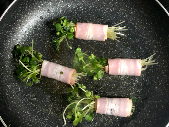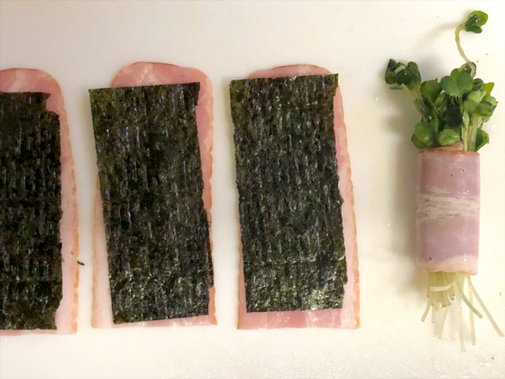 ・ベーコンの上にのり→かいわれの順に巻いていく。