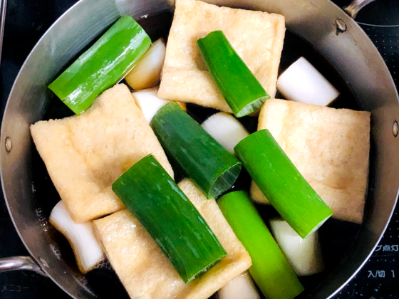 ① 鍋にうどんのつゆ調味料を入れて沸騰させ、白ネギと油揚げを入れて中火で加熱させながら味を染み込ませる(10分ほど)。