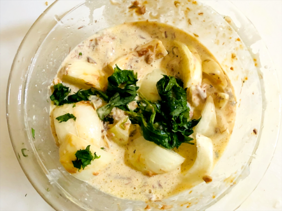 ・玉ねぎはくし切りに、大葉はみじん切りにしておく。※玉ねぎはレンジ600w3分ほど加熱させておきましょう!