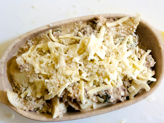 ② 耐熱容器に①を入れ、パン粉、ピザ用チーズを乗せる。