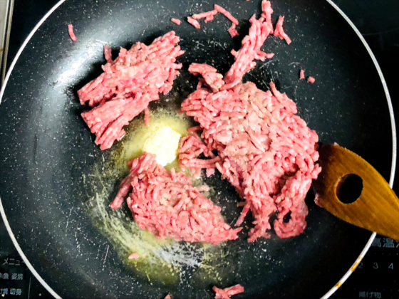 ① フライパンにマーガリンを入れて中火で熱し、牛ひき肉を入れる。