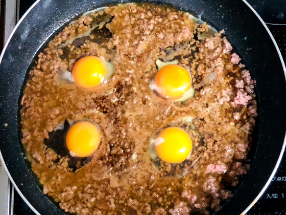 ③ 味が全体に馴染ん炒めた牛肉ミンチをフライパン全体に広げてたまご4つ落とす。