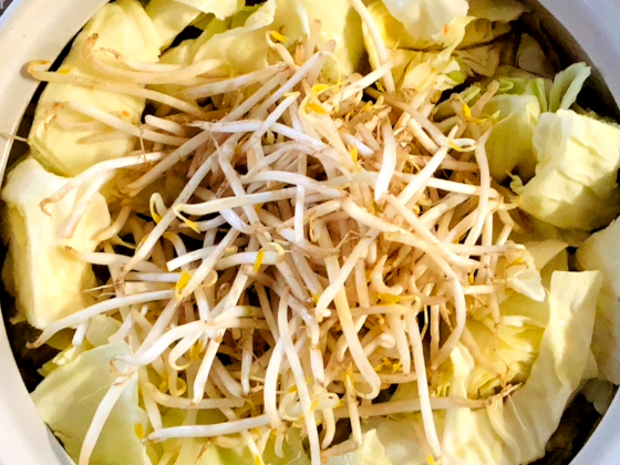 ③ 約5cm幅の大きめザク切りにしたキャベツをドーナツ型に盛り、真ん中にもやしを山盛りで豪快に乗せる。