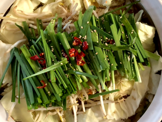 ④ その上から約7cm幅に切ったニラを横一列に並べ、乾燥ニンニクチップを適量に散らして、白ごまと輪切り唐辛子をトッピング。