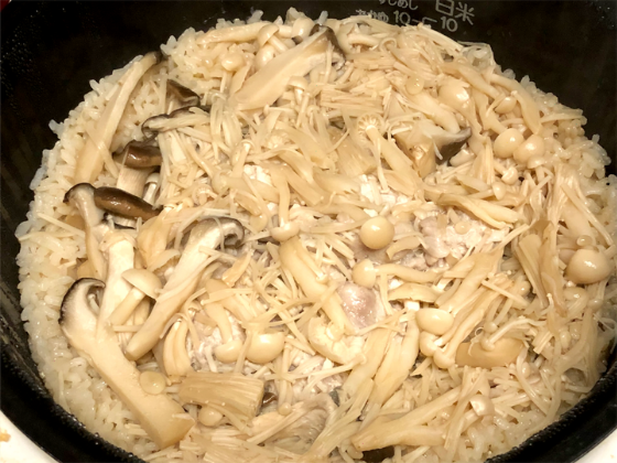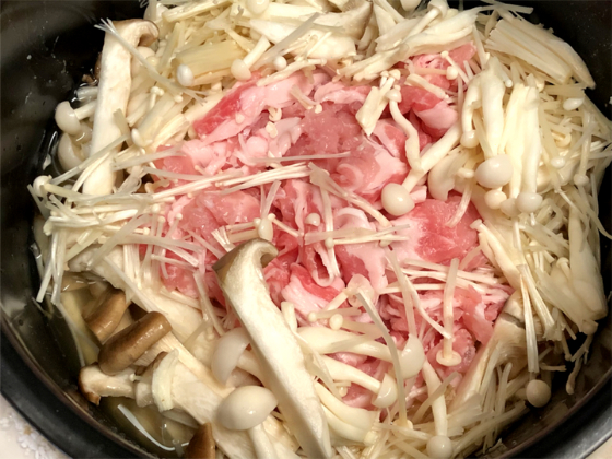 ① お米を研ぎ、炊飯器に研いだお米・炊き込み調味料・水・豚肉・下ごしらえしたきのこを入れる。