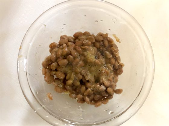 ② 全体的に混ぜ合わせれば、なっとうを入れてさらに混ぜ合わせる。