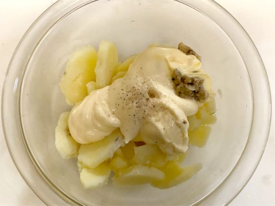① ボウルにじゃがいもを加え、ポテトサラダ調味料を入れる。