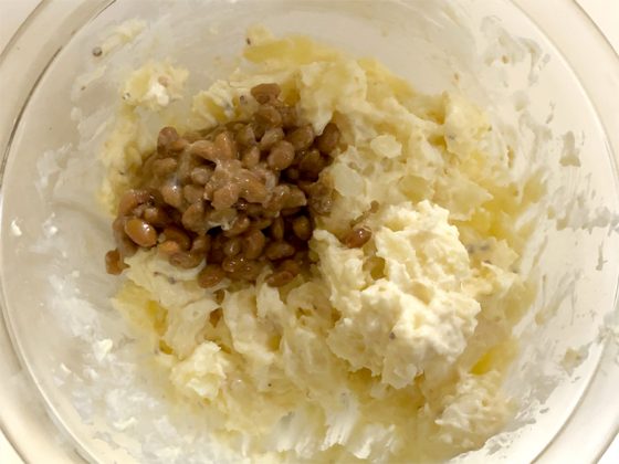 ポテトサラダになっとうを加えてみました!意外な組み合わせですが、クセになる1品です😁