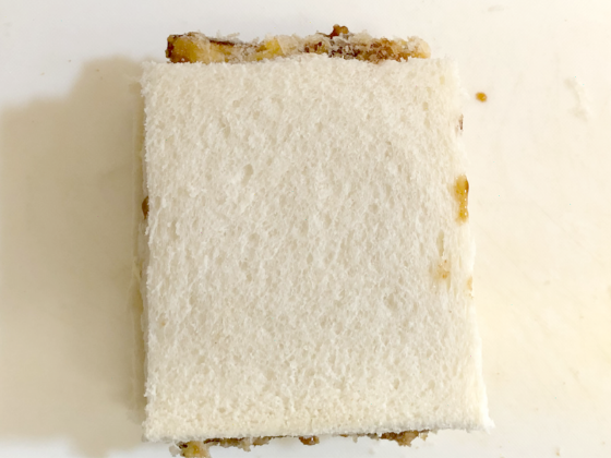 ② ①にレシピ:パンの耳で作るお好み焼きフライを乗せ、もう1枚のパンと重ね合わせる。