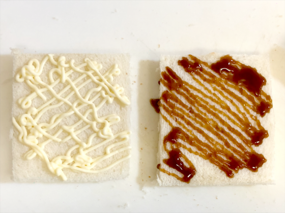 ① 食パンにマヨネーズ・お好みソースを片面に塗っておく。