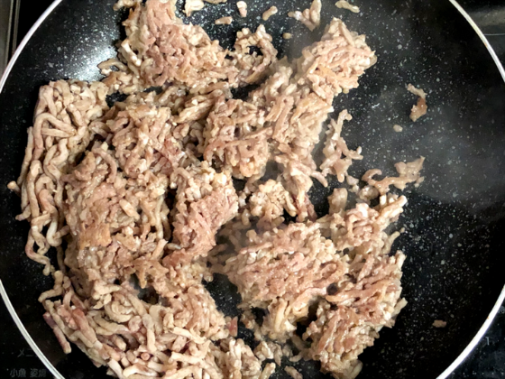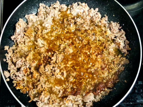 ① フライパンにサラダ油を引いて、牛ひき肉を入れる。