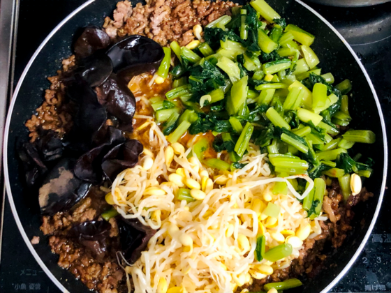 ③ ②にキクラゲ、豆もやし、野沢菜を加えて炒めていく。