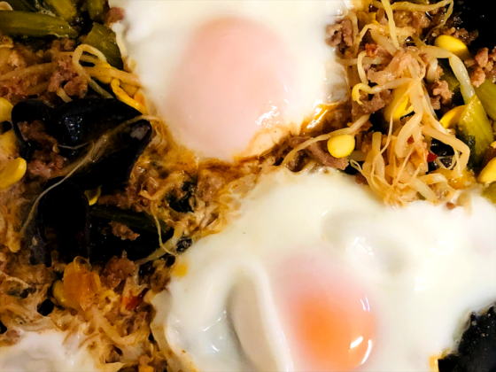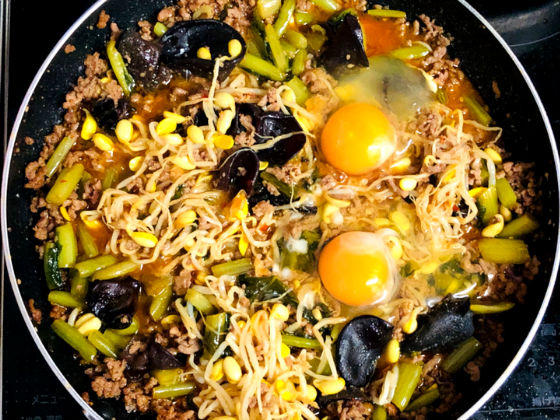 ⑤ たまごがいい感じに火が通れば完成です!⑤をお好みでご飯にかければ手抜きビビンバの出来上がり🌟
