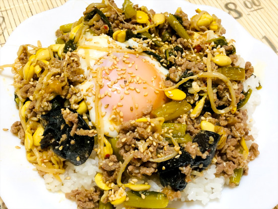 牛挽肉、豆もやし、キクラゲ、たまごだけの簡単ビビンバ!ほうれん草や小松菜、にんじん、もやしなどはお好みで調整してみてください♪
