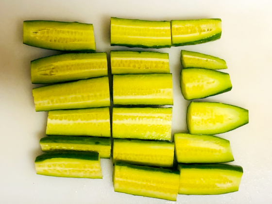 きゅうりを半分に切り三等分にしていきます。