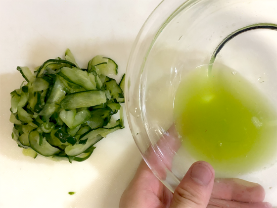 きゅうりを塩揉みしたら5~7分置いて、それからギュッと水分を絞りましょう!
