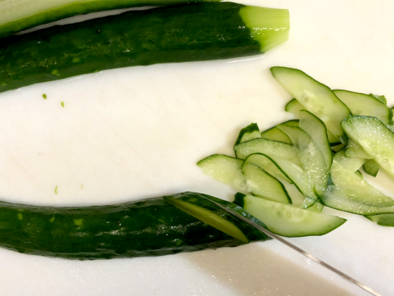 きゅうりは縦半分に切って、切り口を下にして安定させてから斜め薄切りにしていきましょう(厚みは2~3㎜くらいを目安に)→この薄切りの状態にした後に、塩をまぶして、水気を外に出していく準備が完了になりました♪