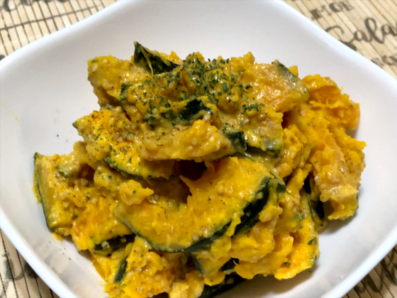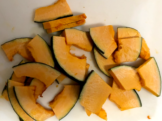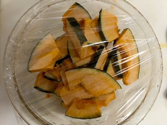 ・かぼちゃを切り、耐熱容器に乗せてラップをかけ、600w6~7分加熱させておく。