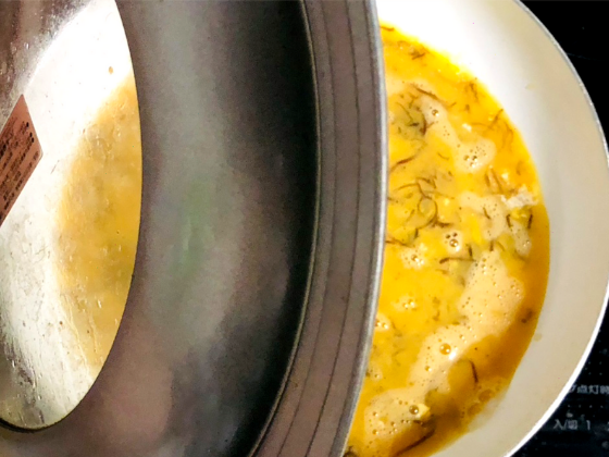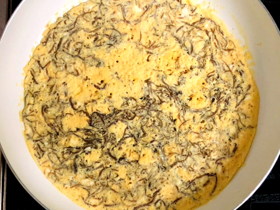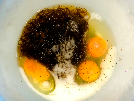 ・ボウルにもずく、白だし、たまご、牛乳、黒胡椒を入れてかき混ぜる(空気を入れ込むように混ぜましょう)。