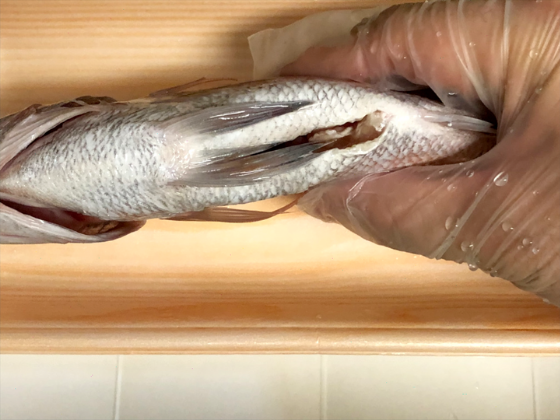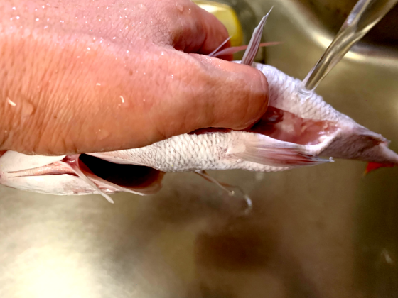 内臓を取り外しても、腹の中には内臓の残りや血わたが残っている場合があります…💦これが臭みや傷みの原因になるので、流水でしっかり洗い流しましょう!(ブラシなどを使用して洗うとやりやすいですよ)。