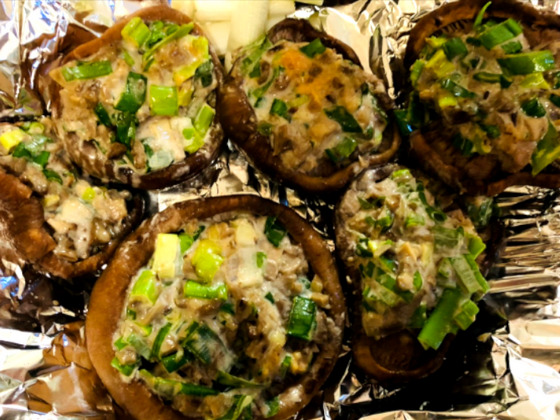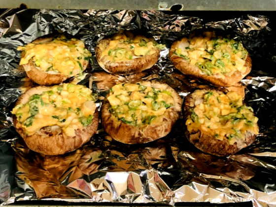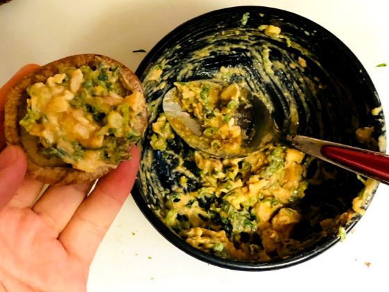 しいたけの肉詰めならぬ、しいたけのギュウギュウ詰め🌟具材は、しいたけの軸と青ネギそれから、味噌とマヨネーズで味付け!