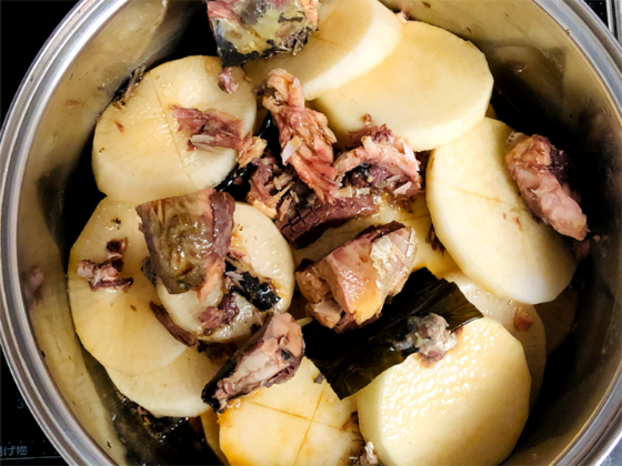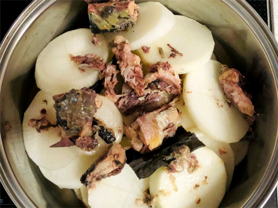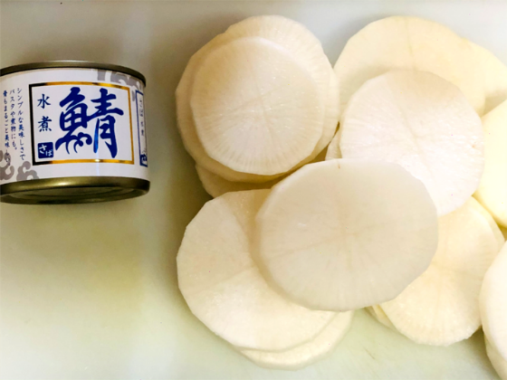 ① お鍋に大根を並べてその上にカット昆布サバの水煮缶の順に入れる(水煮缶の汁も全て入れる)。