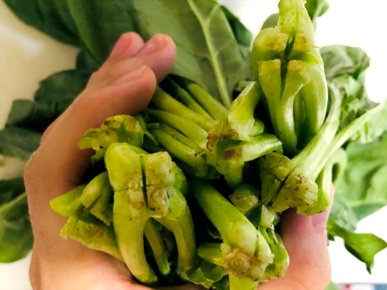 ② 切り込みを入れたら土も落ちやすいので、この状態にした後にあらいます。まず、ため水の中で細かく切った根元側を揉むようにして洗うと洗いにくい付け根の泥がこれで落ちてくれます👀続けて水を取り替え、反対側の葉も洗っていきましょう🌟