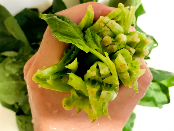 ほうれん草は切った後に水気が出やすいので、料理に使う幅に切った後、もう一度しっかり水気をしぼることも大切です!