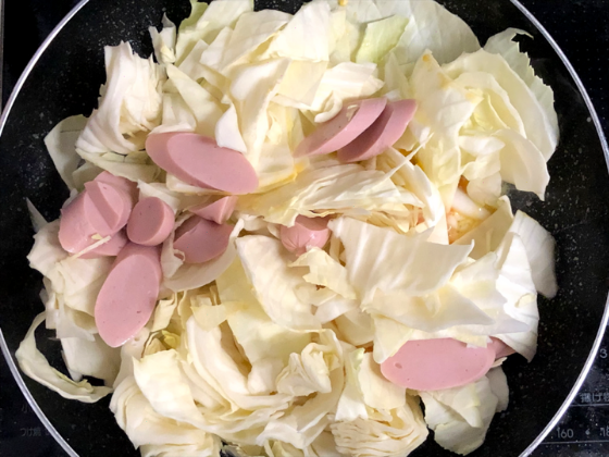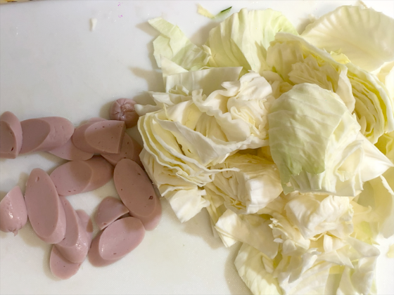 ・キャベツは、ざく切りに魚肉ソーセージは、斜め切りにしておく。