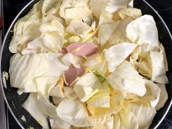 ② たまごが軽く固まってきたら、①に下ごしらえしたキャベツと魚肉ソーセージを入れる。