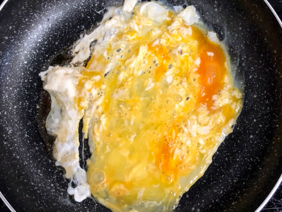 ① フライパンにごま油を入れ、中火にしてたまごを加える→たまごを加えたら、かき混ぜる。