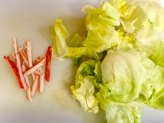・レタスは食べやすい大きさに手でちぎり、カニカマは縦切りに。