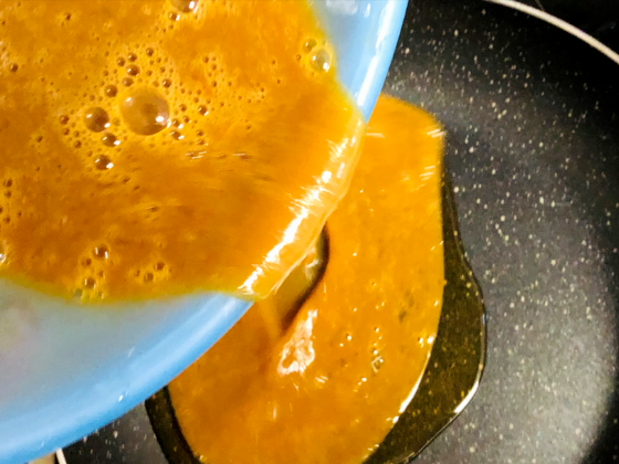 ① フライパンを温めてごま油をひき、強火で下ごしらえしたたまごと中華炒め調味料を炒め合わせる。