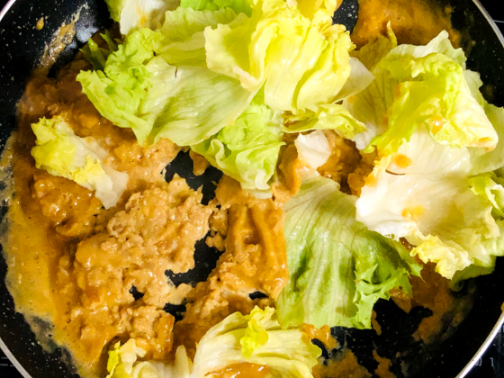 ② 半分くらい火が通ったところでレタスとカニカマを入れて30秒ほど炒める。