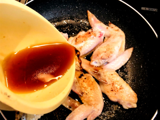 ② 焼き色がついたら強火にして甘ダレ調味料を加えて、鶏の手羽先をよく絡み合わせていく。