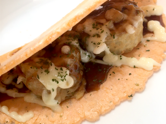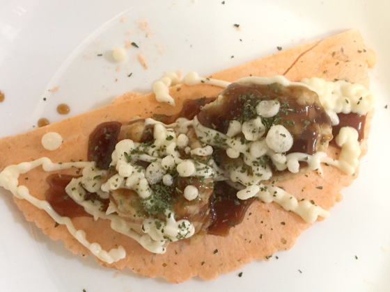 ② あとは、軽くたこ焼きをたこせんべいで押しつぶして完成です!。